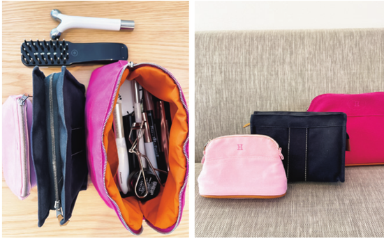 常用手部消毒液和护手霜、唇彩等化妆品。把它们放进很好用的化妆包里。