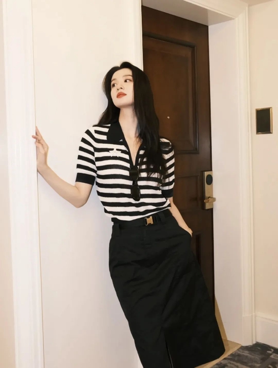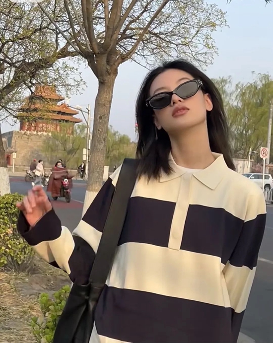 外出游玩的时候,当然也少不了一副墨镜。邱天的条纹Polo衫搭配窄边的猫眼墨镜,时髦感提升。