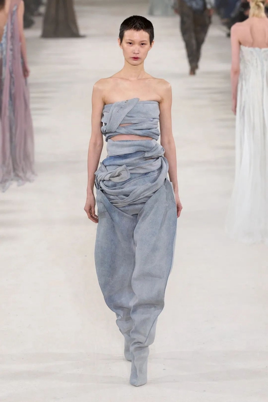 Y/Project在Fall 2023 Ready-to-Wear中则将牛仔转换至流浪旅人的现场。镂空不对称剪裁,还是顽皮从腿侧缝延伸到鞋中缝的裤靴,搭配层层叠叠的牛仔布条,都彰显了设计师的大胆玩味和扎实功底。
