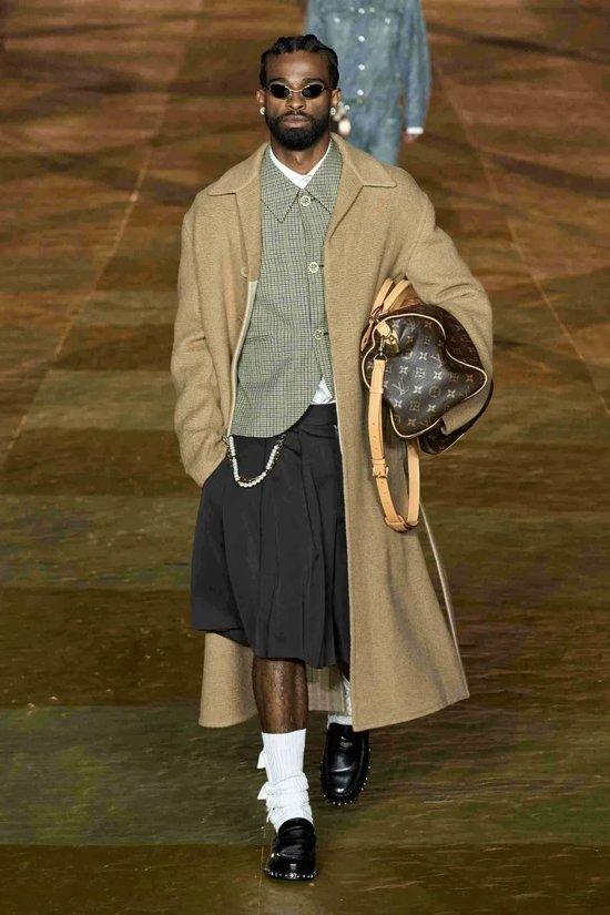 此外,百褶裙还可以跳出女装的范畴,在男装领域大显身手,Pharrell Williams在他的Louis Vuitton男装首秀中就融入了百褶裙裤。该系列以“爱、机遇和赋能”为主题,将百褶裙裤与大衣、西装、斜纹软呢搭配在一起,配饰上运用大量珍珠元素,整体造型得体而充满活力,也传递出当下多元审美时代的包容与热爱。