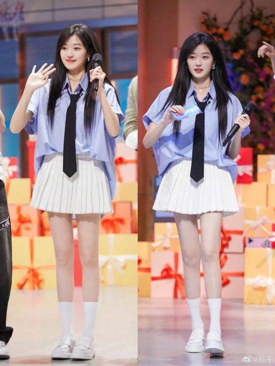 同理,孙千用白色百褶裙搭配蓝色衬衫,脚踩小白鞋,饱含青春活力,但耳后和颈间的配饰,以及偏分的发型又增添了成熟感,恰到好处地把握住少女与熟女间的分寸。